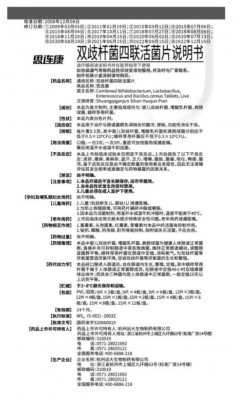 The following is the revised version of the latest product manual of Siliankang (Bifidobacterium quadruple viable tablets) produced by Hangzhou Yuanda Biopharmaceutical Co., Ltd. on December 16, 2022;