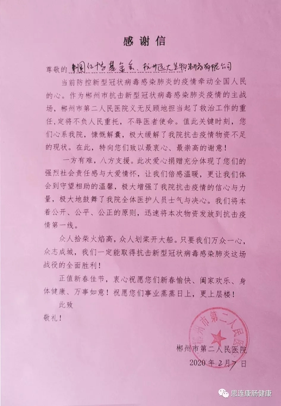 杭州遠(yuǎn)大生物制藥有限公司負(fù)責(zé)人表示:“希望通過捐贈(zèng)思連康,在疫情的防控方面盡微薄之力,使患者早日康復(fù),疫情早日結(jié)束?!?/span>