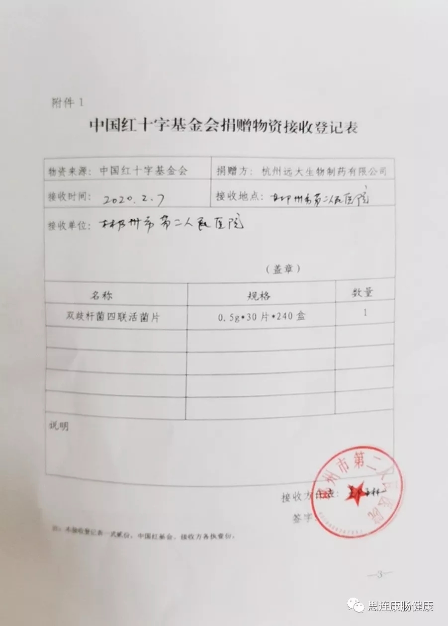 在得知防疫一線急需微生態(tài)藥品后,2020年2月6日,杭州遠(yuǎn)大生物制藥有限公司立即啟動(dòng)捐贈(zèng)程序,決定第一批捐贈(zèng)價(jià)值100萬元的雙歧桿菌四聯(lián)活菌片(思連康),專項(xiàng)用于疫區(qū)新型冠狀病毒肺炎的防治。目前第一批價(jià)值100萬元雙歧桿菌四聯(lián)活菌片(思連康)已全部送達(dá)湖北、浙江、湖南等地醫(yī)院;第二批價(jià)值130萬元的思連康(雙歧桿菌四聯(lián)活菌片)也已于昨日(2月12日)開始配送醫(yī)院。