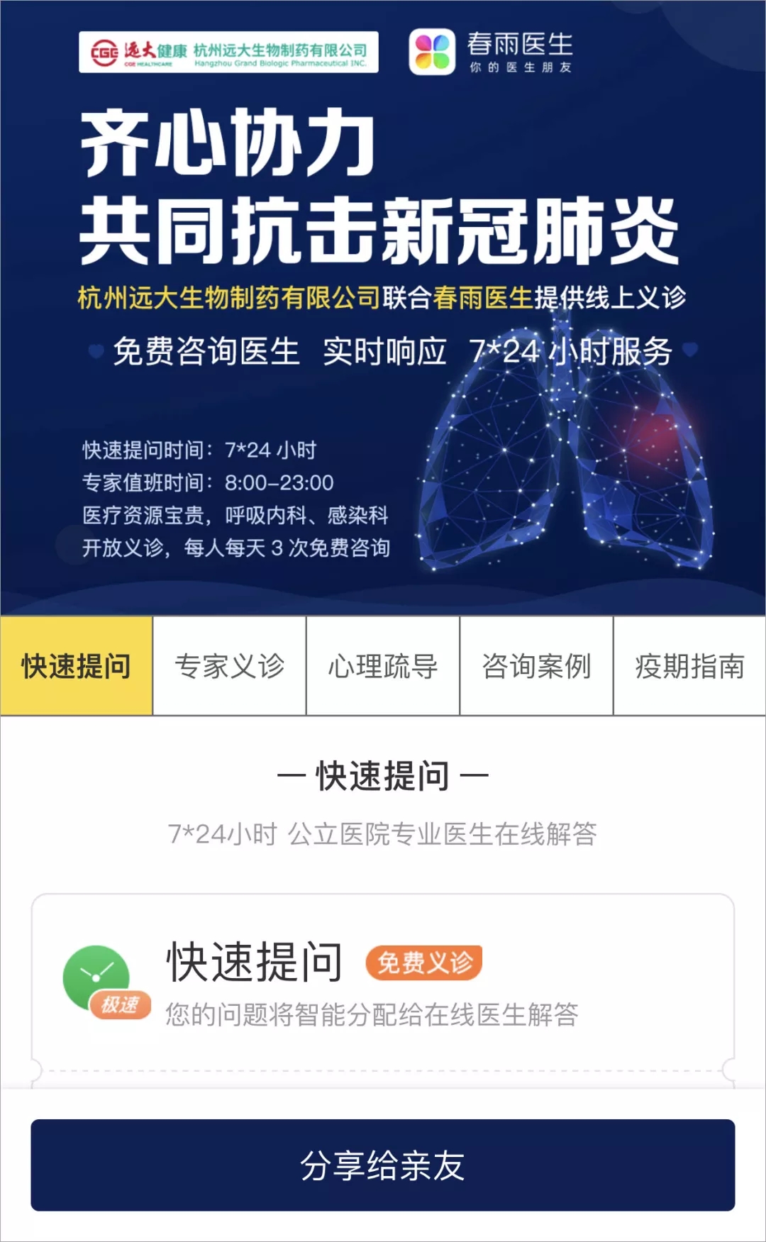 杭州遠(yuǎn)大生物制藥有限公司聯(lián)合國(guó)內(nèi)多家知名醫(yī)療在線垂直領(lǐng)域問診平臺(tái)春雨醫(yī)生、快速問醫(yī)生、妙手醫(yī)生共同發(fā)起免費(fèi)在線義診活動(dòng)
