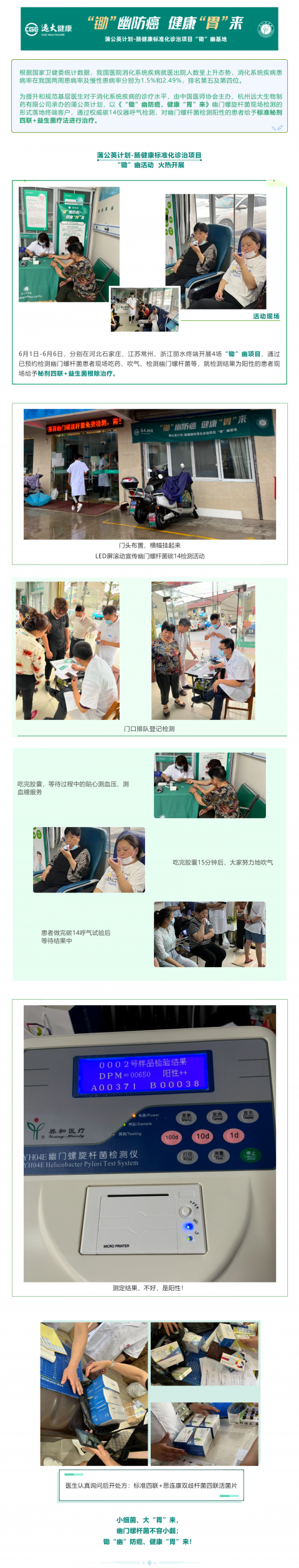 為提升和規(guī)范基層醫(yī)生對(duì)于消化系統(tǒng)疾病的診療水平,由中國(guó)醫(yī)師協(xié)會(huì)主辦、杭州遠(yuǎn)大生物制藥有限公司承辦的蒲公英計(jì)劃,以《“鋤”幽防癌,健康“胃”來(lái)》幽門(mén)螺旋桿菌現(xiàn)場(chǎng)檢測(cè)的形式落地終端客戶,通過(guò)權(quán)威碳14儀器呼氣檢測(cè),對(duì)幽門(mén)螺桿菌檢測(cè)陽(yáng)性的患者給予標(biāo)準(zhǔn)秘劑四聯(lián)+益生菌療法進(jìn)行治療。